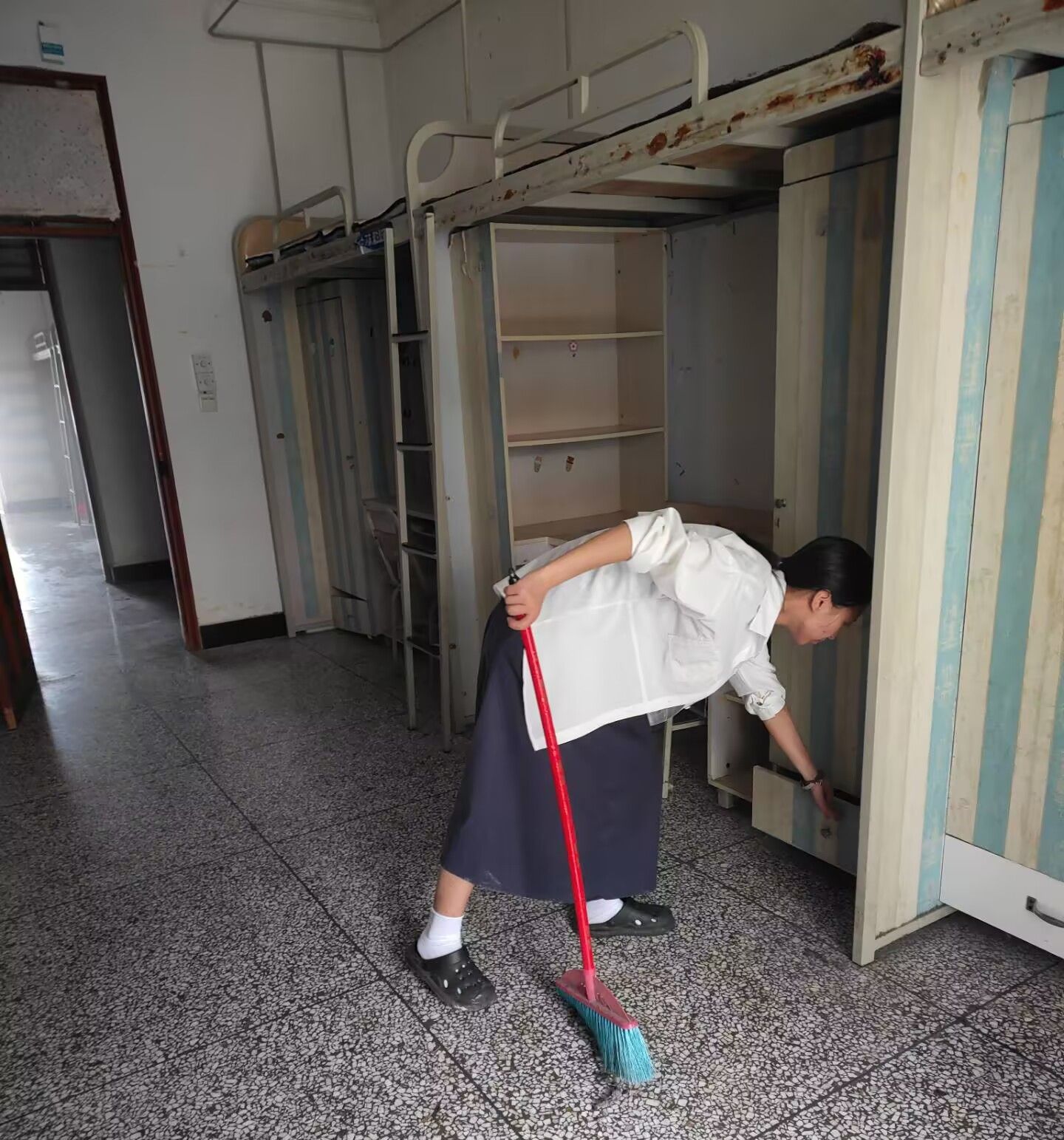 在活动开始前,学长学姐们眼神坚定,心中满是对新生的期待。随后迅速分工合作,投入到紧张有序的清扫中。他们手持扫帚、抹布和水桶,认真清理寝室的地面、桌椅、床铺和窗台,不放过任何一个角落。大家分工明确、互相协作,有的擦拭玻璃,有的整理公共区域,忙碌的身影在寝室楼内穿梭。尽管天气炎热,但同学们依然干劲十足,汗水浸湿了衣襟,却依旧专注、认真。