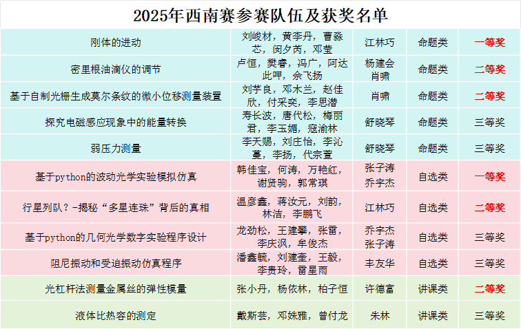 本次竞赛由教育部高等学校大学物理课程教学指导委员会大学物理实验专项委员会西南地区工作委员会牵头,联合四川、重庆、云南、贵州、西藏五省(区、市)物理学会共同主办,西南地区数十所高校踊跃参与。物理与光电工程学院学子凭借扎实的物理学专业知识、卓越的创新实践能力与良好的团队协作精神脱颖而出。这些优异成绩的背后,既凝聚着学生们的刻苦钻研与创新探索,也离不开指导老师们的悉心指导与辛勤付出。
