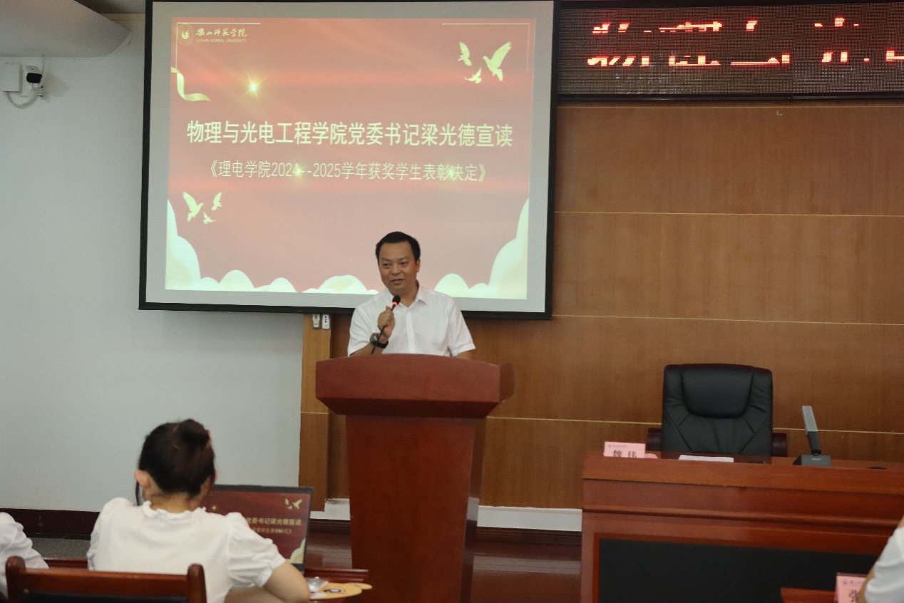学院党委书记梁光德宣读了《物理与光电工程学院关于2024 - 2025学年度优秀学生的表彰决定》,并为获奖学生代表颁发荣誉证书,激励全体新生以优秀同学为榜样,见贤思齐,努力拼搏,在大学期间取得优异成绩。