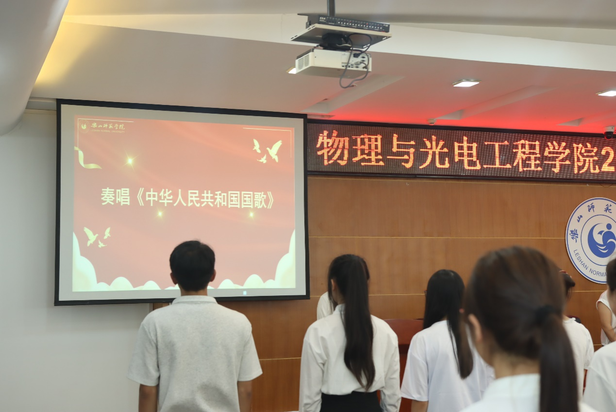 随后,全体人员肃立,齐声奏唱《中华人民共和国国歌》。激昂的旋律在报告厅内回荡,庄严的国歌声为开学典礼正式拉开帷幕。