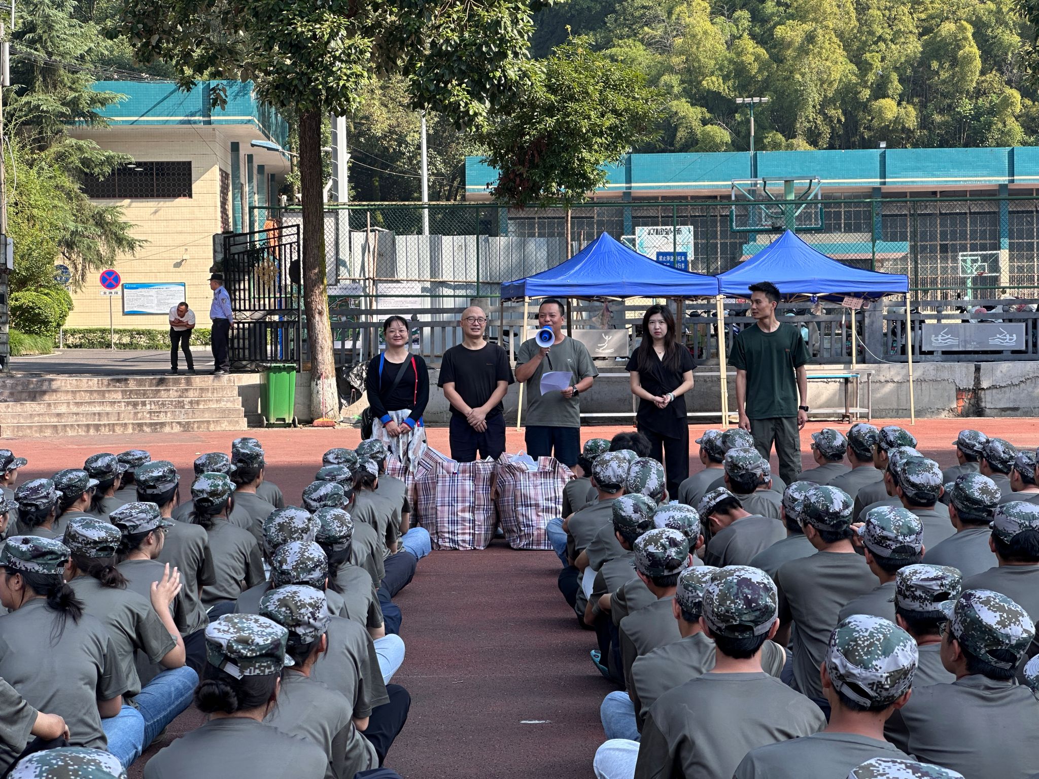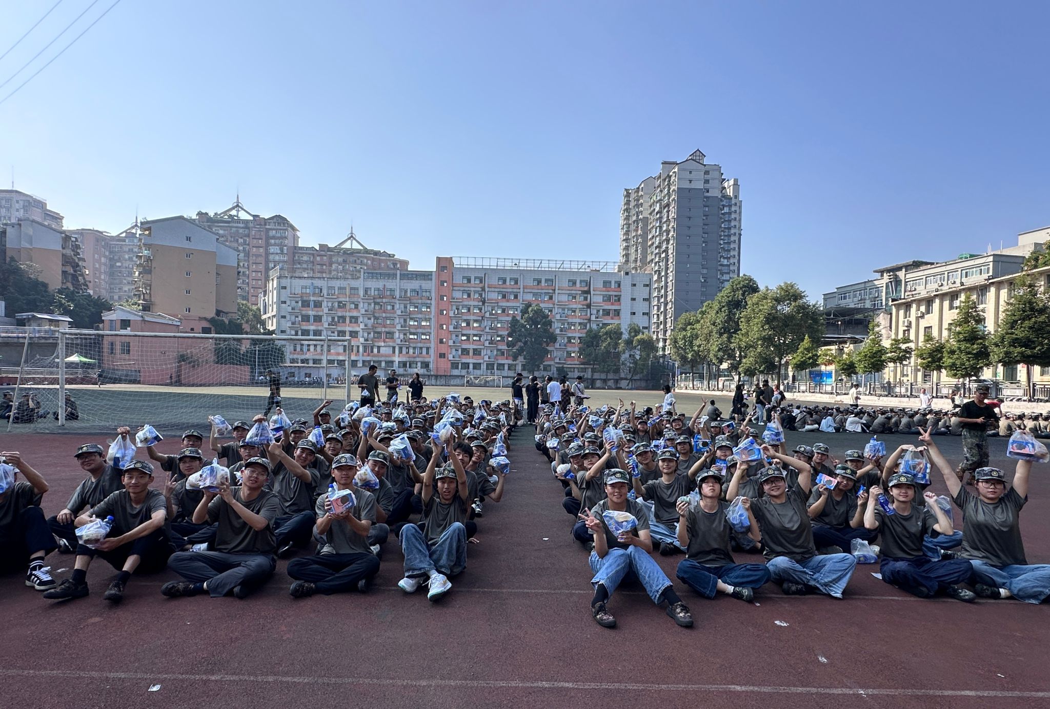 训练间隙,学院领导和老师亲手将饮料、面包、饼干等慰问品递到新生手中,指尖传递的不仅是补给,更是满满的牵挂。“感觉晒黑了,训练累不累?”一句句朴实又贴心的询问,像家人般驱散了新生们的疲惫,让训练场瞬间充满暖意。