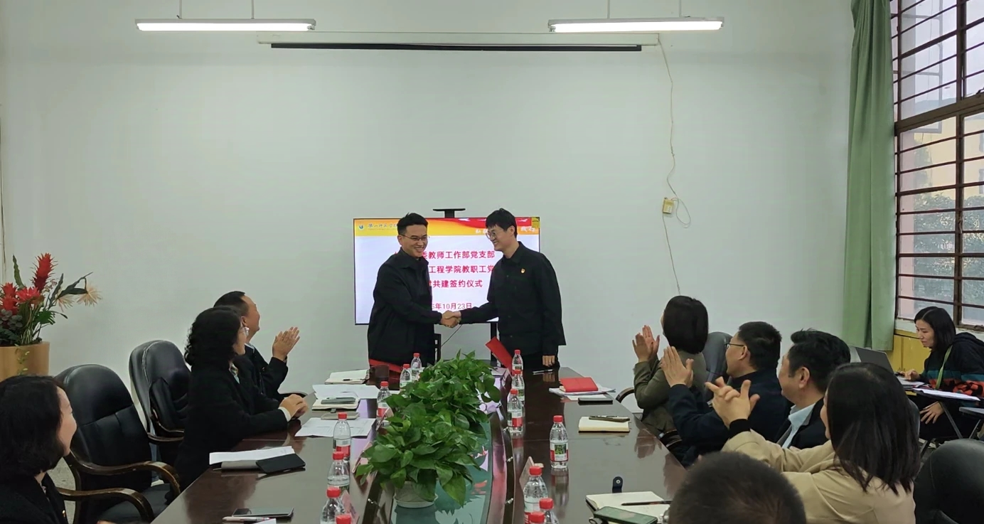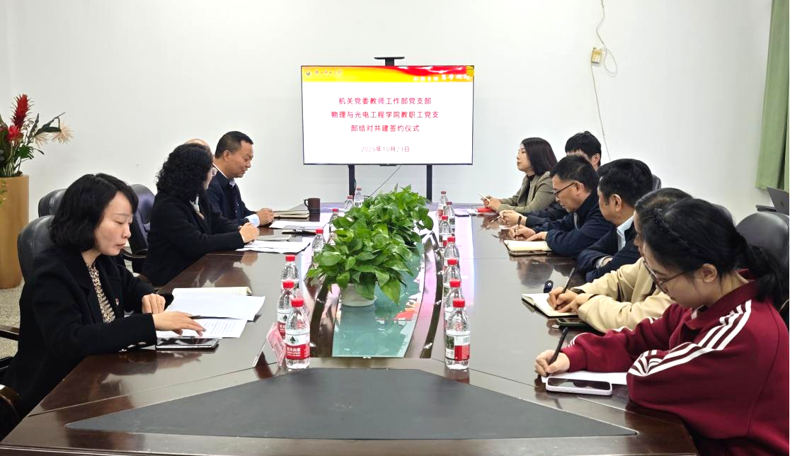 本网讯(文/袁原 图/袁原、赵琴芳)10月23日下午,为深入贯彻落实新时代党的建设总要求与新时代党的组织路线,切实推动基层党组织建设提质增效,落实高校基层党建“围绕业务抓党建,抓好党建促业务”核心原则,机关党委教师工作部党支部与物理与光电工程学院(以下简称“理电学院”)教职工党支部结对共建框架协议签约仪式在德馨楼2楼会议室顺利举行。学校机关党委书记刘馨,机关党委教师工作部党支部书记、人事部部长黄凯,理电学院梁光德、肖志刚及双方全体党员同志共同参加活动。